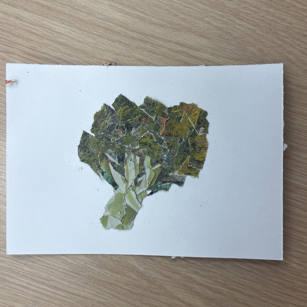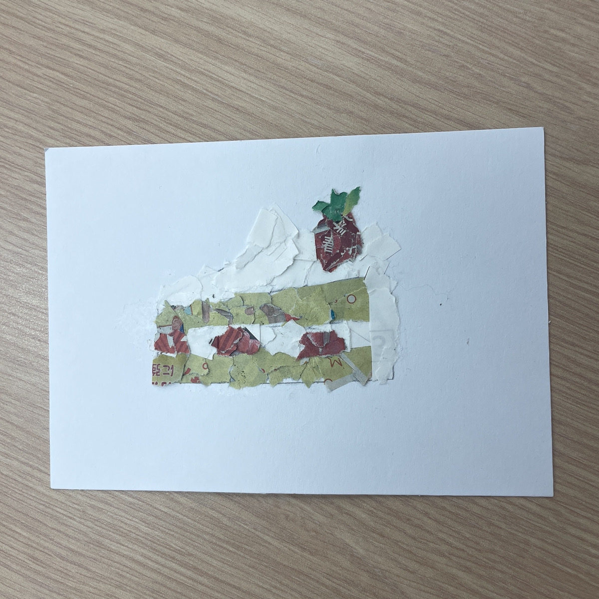 ブロッコリー、ショートケーキと食べ物モチーフの2作品です。 ショートケーキの苺は生肉の写真を一部使っていて、肉と苺のジューシーさが近いと感じ、この作品ができました☺