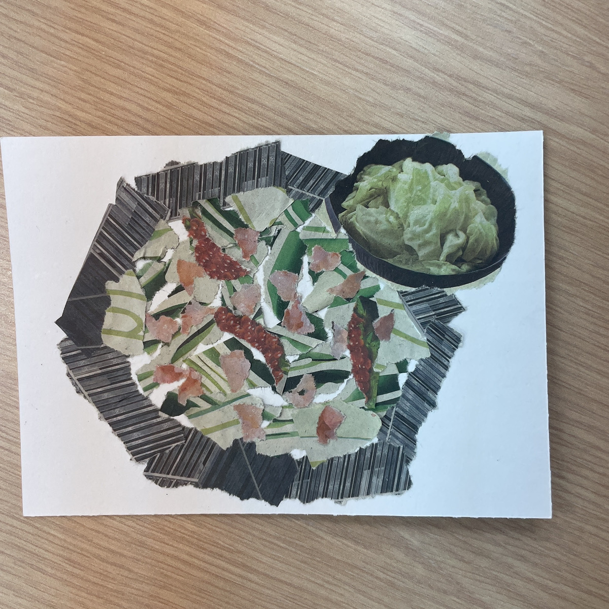 こちらは好きなレストランのサラダをちぎり絵で作った作品です。色々な新聞を見比べて素材を選んでいた時、エビの写真を見つけて「これだ!」となったそうです。お皿の質感も素敵ですね!
