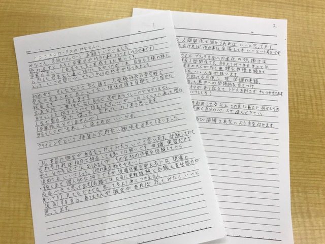 (追記)Aさんがにこにこへの手紙を書いてくださいました。にこにこでの1年間はAさんにとって最も楽しめた期間だったと書いてくださっています。社会復帰の為の訓練の場所ではありますが、Aさんが少しでも元気になれた場所になれてよかったなあと感じます。