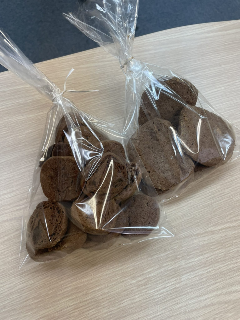 美味しそうなチョコクッキーです!! さっそく熱々の出来立てを試食される方も!焼きたてのクッキーはレア感がありますね。「おいしい!」「ちょうどいい味」など、様々な感想が出ました(^^)/