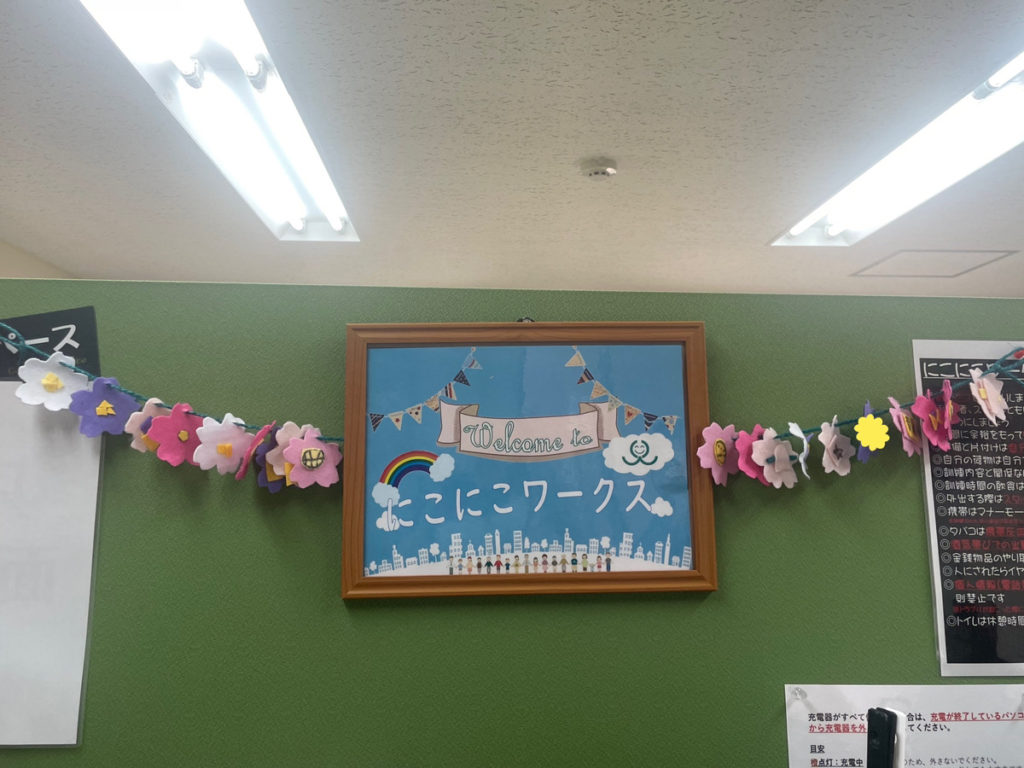 ガーランドは現在にこにこワークスに入ってすぐのところに飾っています♪ ご来所の際は、にこにこワークスの早咲き桜をお楽しみください。