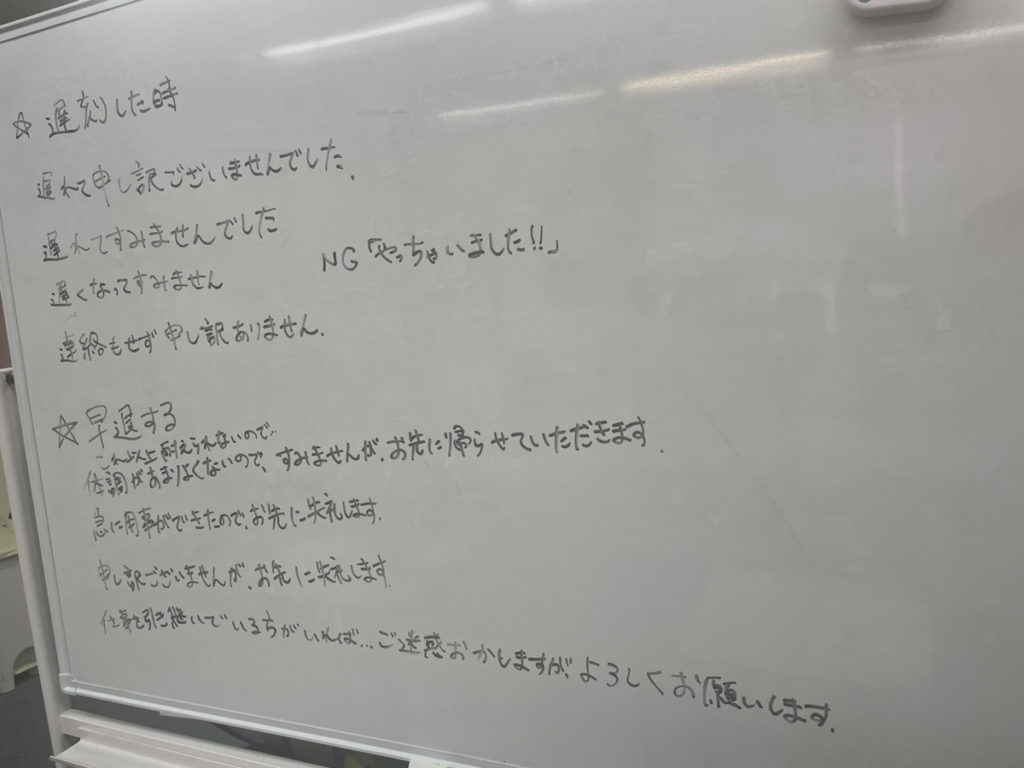 そして、 「遅刻や欠勤をしたら、自分の代わりに仕事をしてくれた人がいるだろうからお礼と謝罪の気持ちを伝える」 「体調を崩していた人は、休んでしまったことに申し訳なさを感じているかもしれないから大丈夫だと伝える」 といった意見も出て、一緒に働く人の気持ちも想定した、素敵な気遣いの言葉をたくさん共有していただきました。