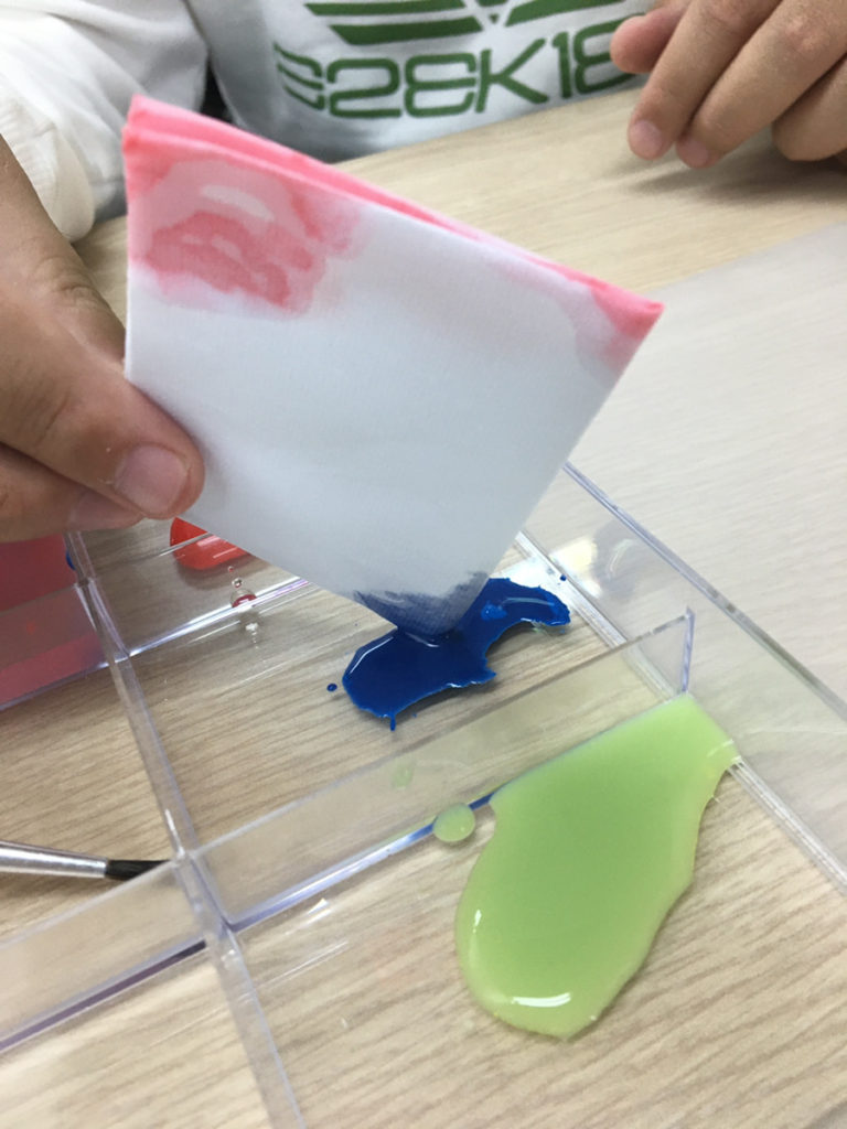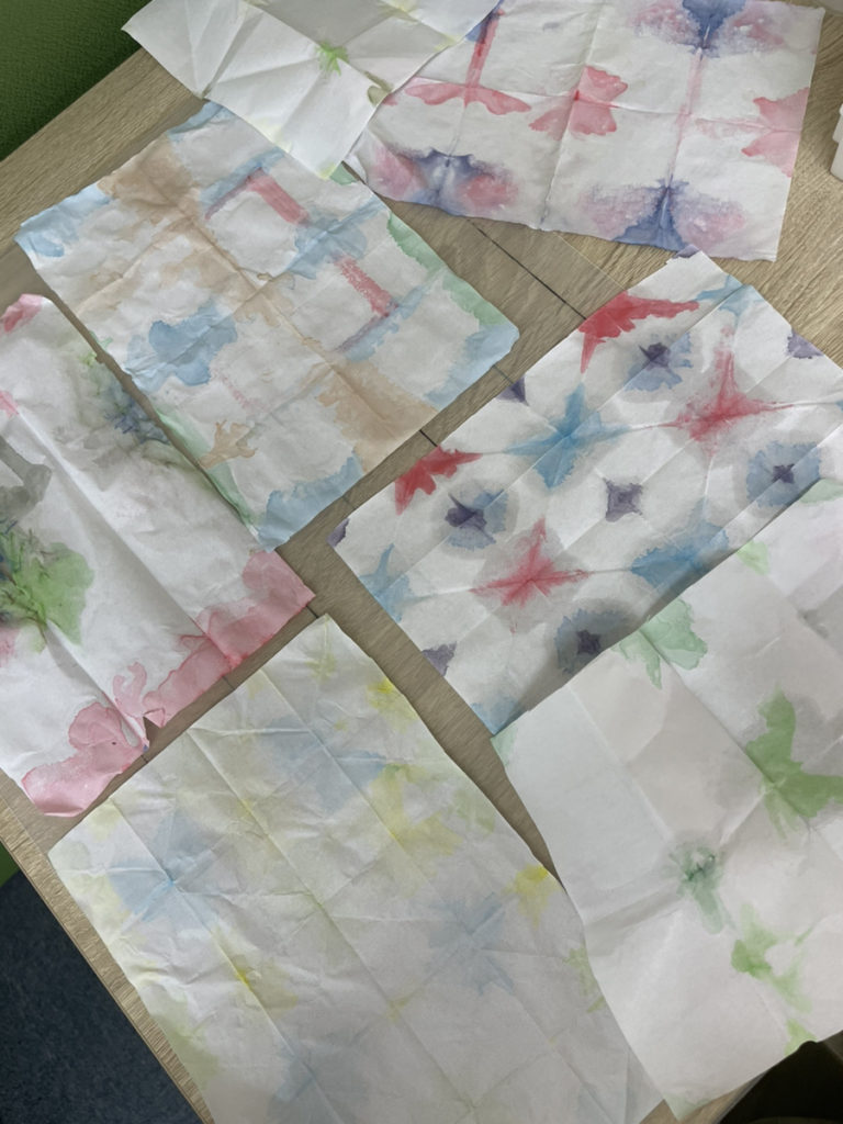 初めの紙を折ることや、色水に浸す時間や、濡れて破れやすくなっている紙を開く工程など、慎重に慎重に進めなければいけないものづくりでしたが、みなさんとても集中して取り組まれていましたね。