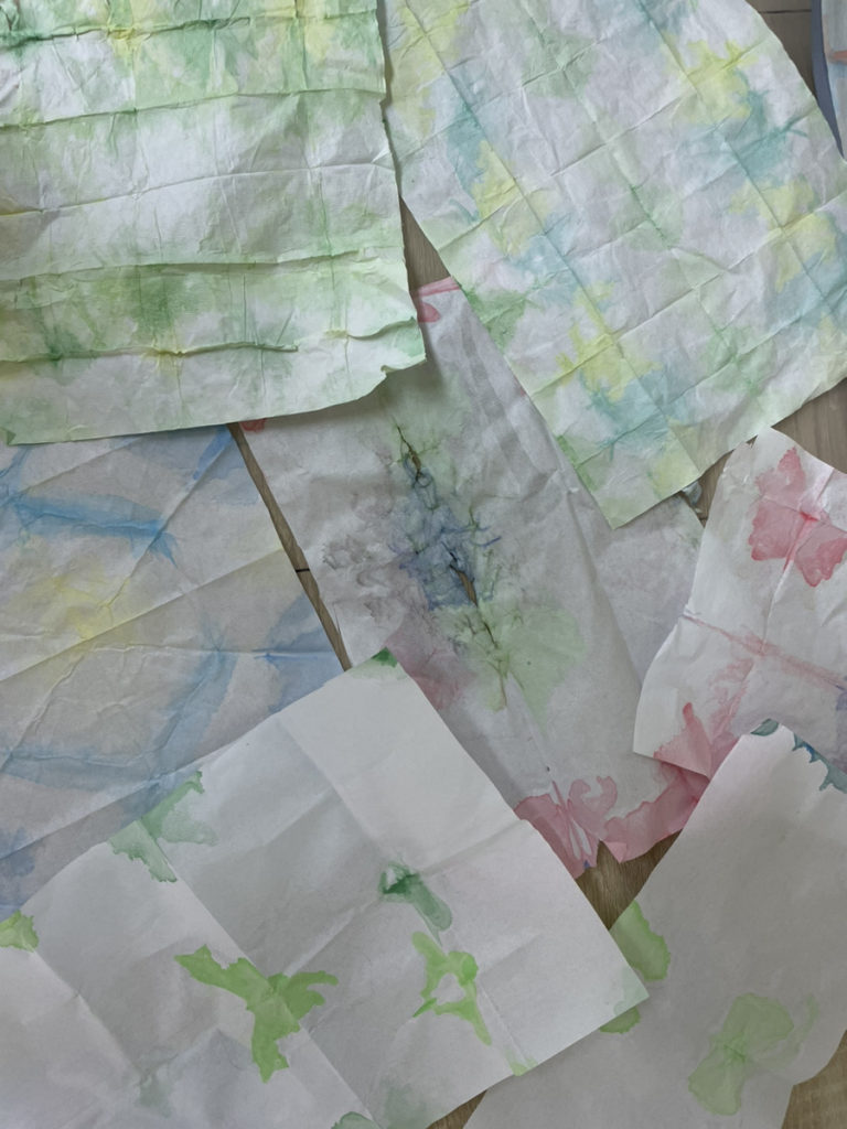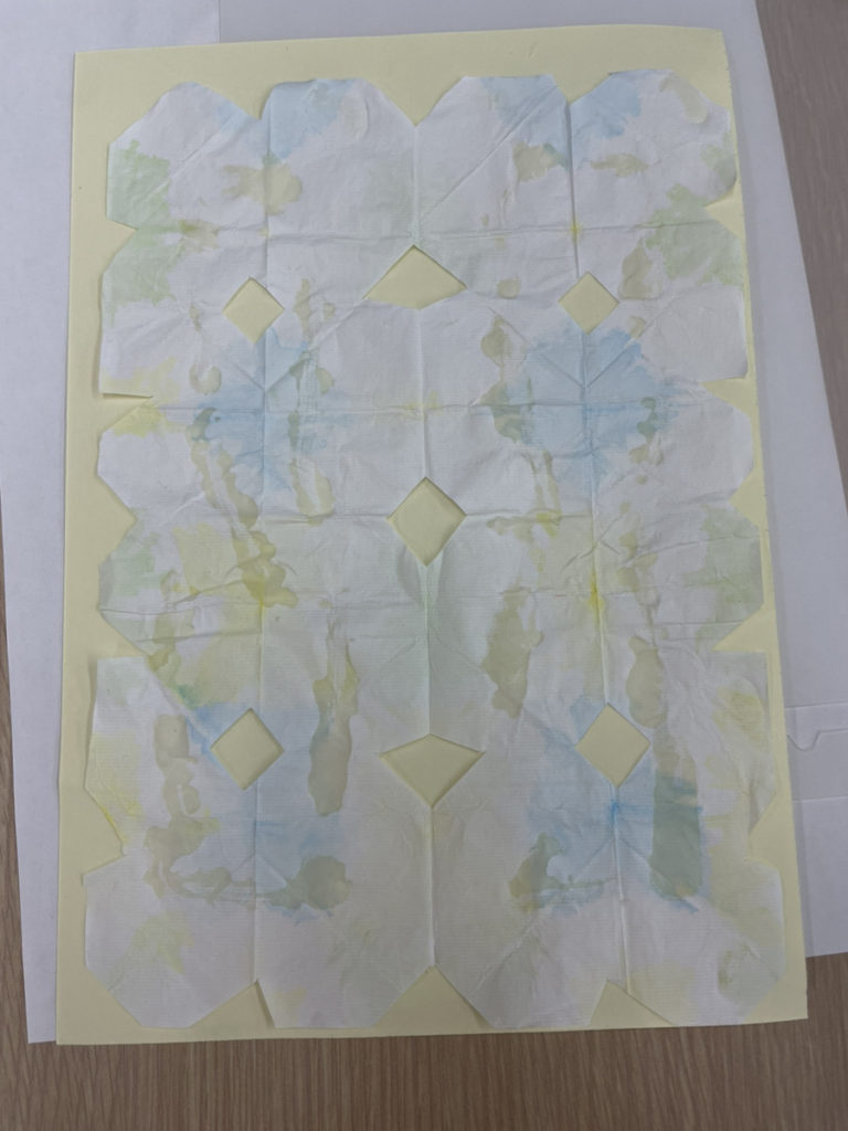 どんな風に折って、どんな風に色水に浸せば、こんな柄が出る……といった法則はあるものの、実際に浸してみると意外と広がらなかったり広がったりと予想外のことが起きましたね(笑)