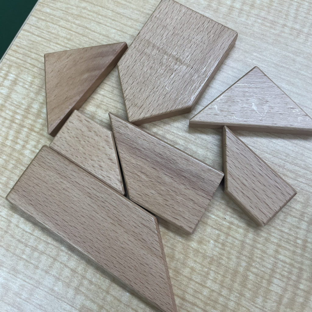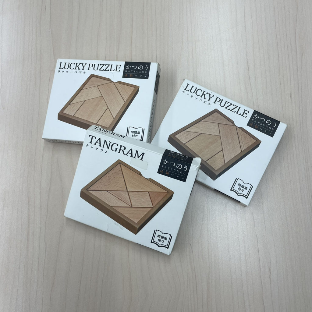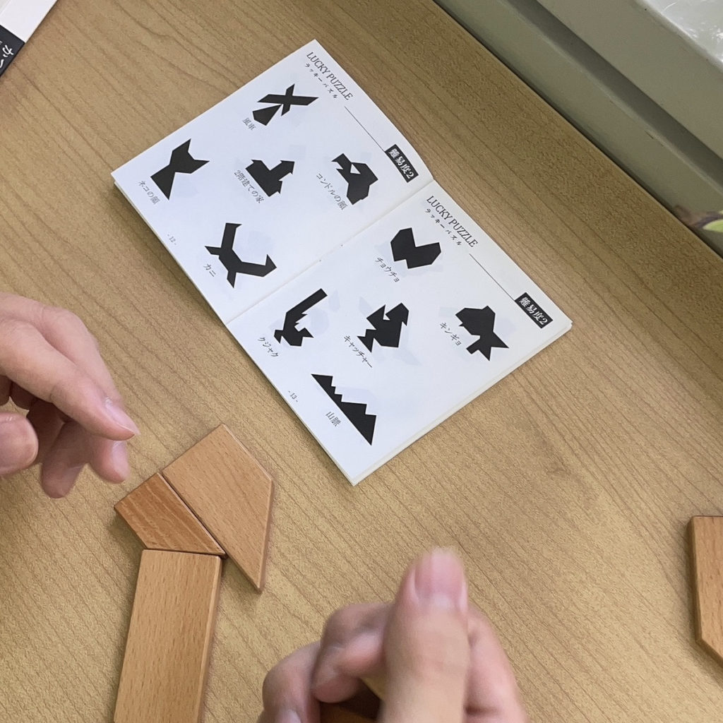 こちらは、問題が黒いシルエットになっており、パズルのピースを使ってその形を組み立てます。 問題のイラストは実際のパズルピースよりも縮尺されており、大きさに囚われずに考えていかなければいけませんΣ(・□・;)