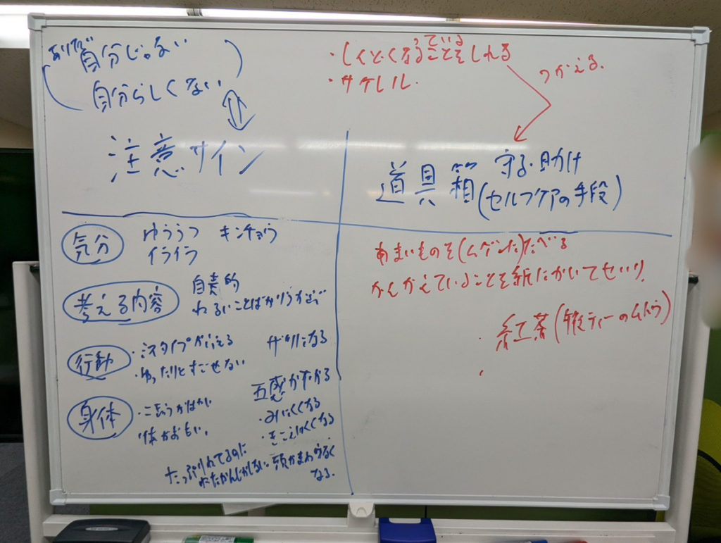 調子を崩したりイライラしたりするときの引き金(状況)、「嫌な感じになっていく……」という注意サイン(状態)に当たった時に、自分らしさを取り戻す道具(セルフケアの手段)になにがあるかを、みなさんで考えました。