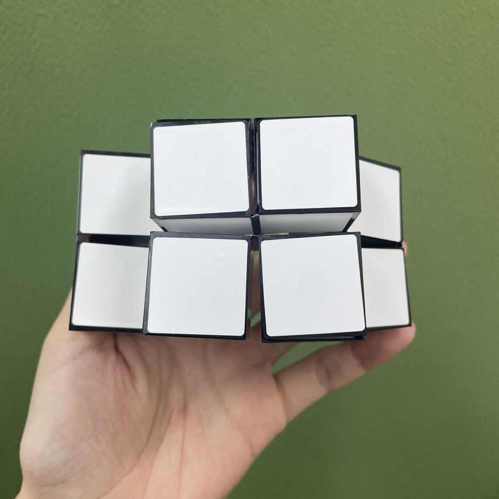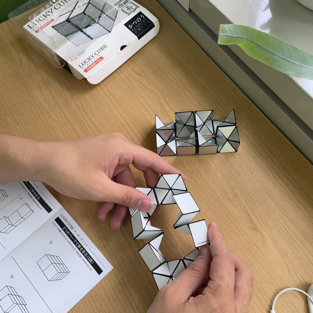 ラッキーキューブは蛇腹のような形状になっており、折ったり捻じったりして形を変えます。 手の中でカチャカチャ動かしていると、ふいに思いもよらない形ができたりします(笑)