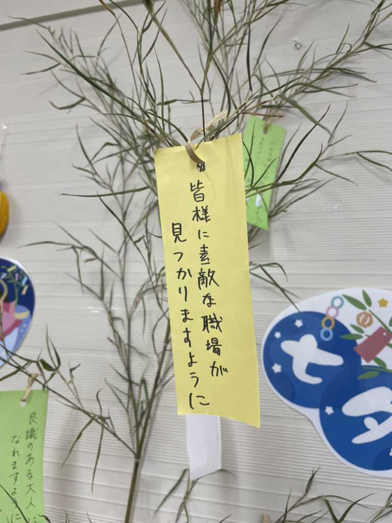 こんにちは。今日は七夕ですね! にこにこワークスでも笹を飾っています♪ 利用者さんたちに短冊をお配りし、七夕のお願い事を書いていただきました。