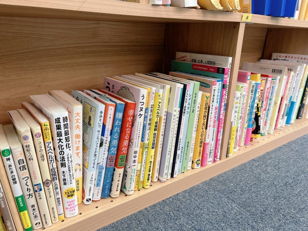 発達障害や精神疾患に関する本、メンタルヘルスやコミュニケーション、対人関係に関する本、ビジネスマナーや仕事の仕方に関する本など様々です。