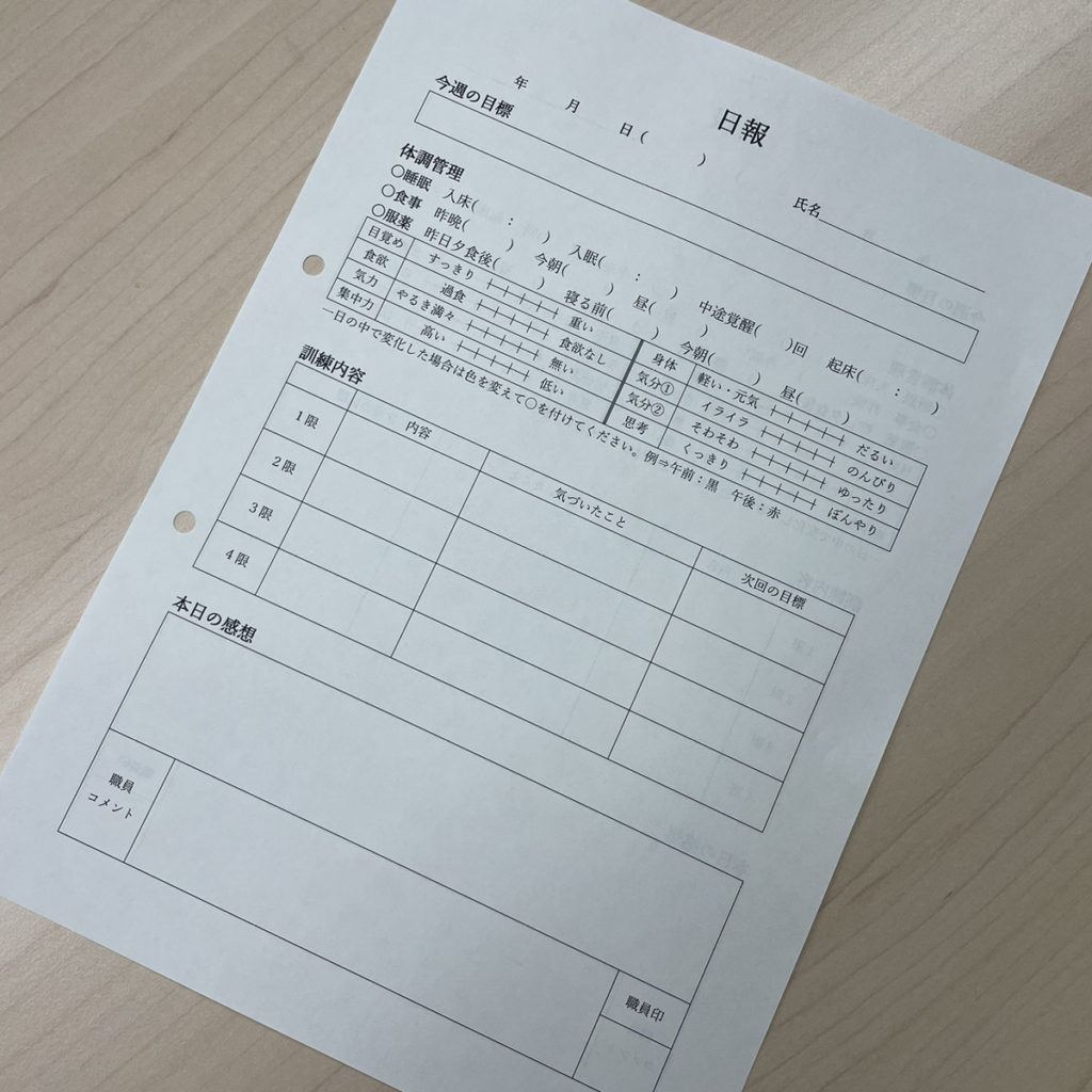 日報は職員も読ませていただきますが、利用者さん自身が今日は何をしたか、何を感じたかなどを記録し、 今後の訓練の計画を立てたり、自分を知ることに役立つツールになればと考えています。