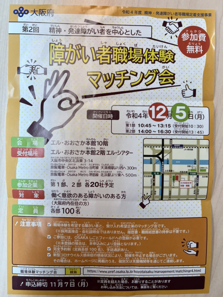 毎年2~3回、大阪府では「障がい者職場体験マッチング会」が開催されており、