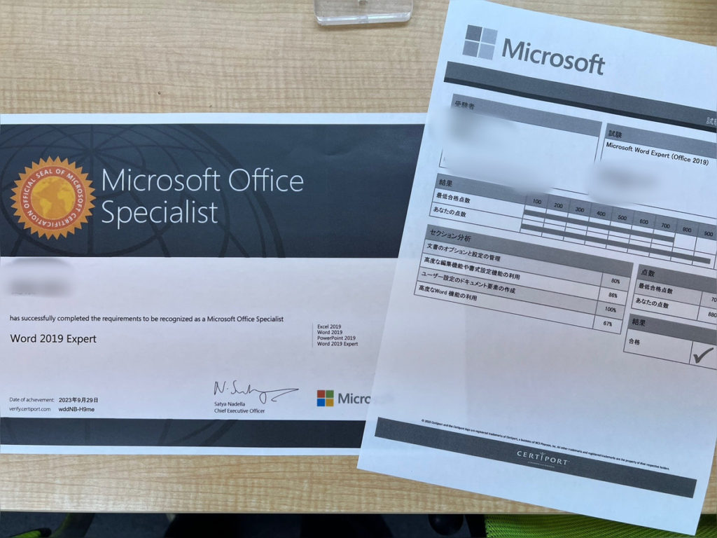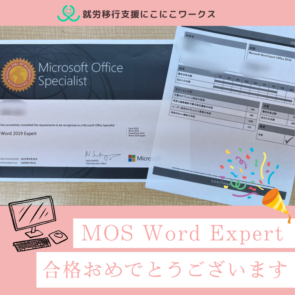 先日利用者さんが、『MOS Word Expert』の資格試験に合格されました!