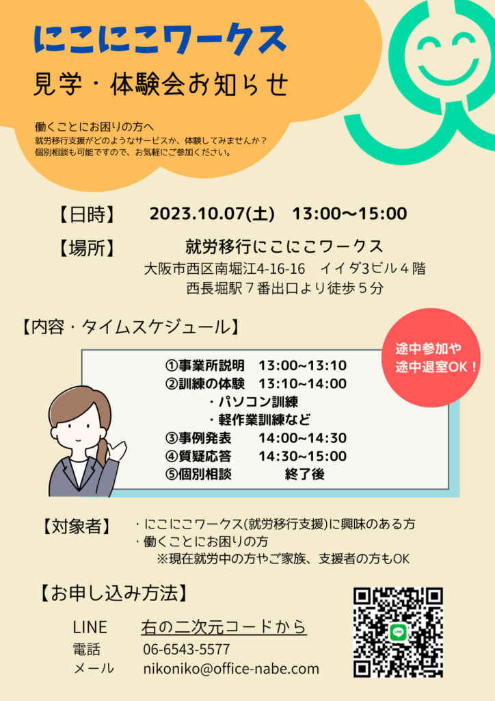 大阪市西区の就労移行支援事業所にこにこワークスで行っている精神疾患や発達障害の方へのサポート ~見学体験会~