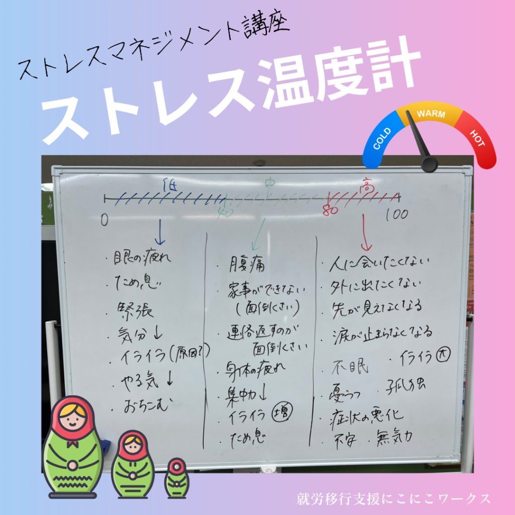 今回は、先日のストレスマネジメント講座で行った『ストレス温度計』についてご紹介します。