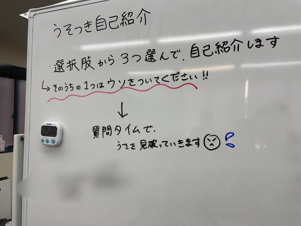 今回は自己紹介の内容を ①好きな芸能人 ②レアな体験 ③好きな食べ物 ④趣味/特技 ⑤行ったことがある場所 に絞り、その中から3つ選んで、1つを嘘の内容にしていただきました。
