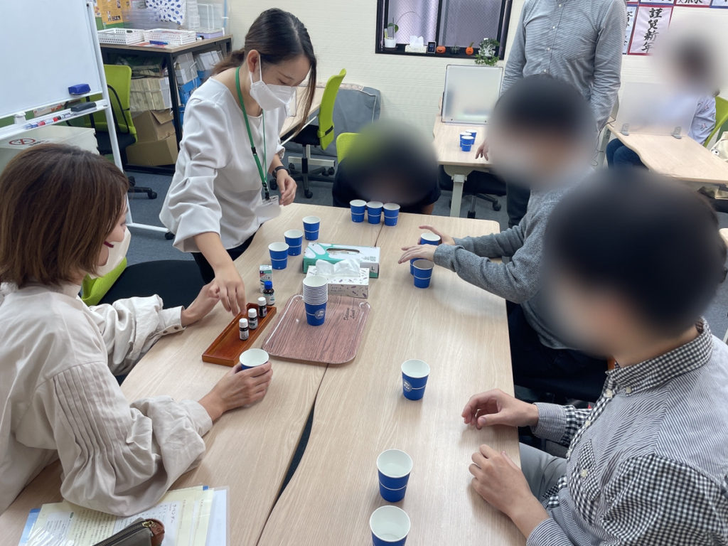 初めて飲むアロマオイルの味に、利用者さんから様々な感想が生まれました。 味によっては意外と飲みやすいと感じた方や、ペパーミントのスースーする感じに驚いたり…… レモンオイルは、レモン水のような味だと仰る方が多かったです。