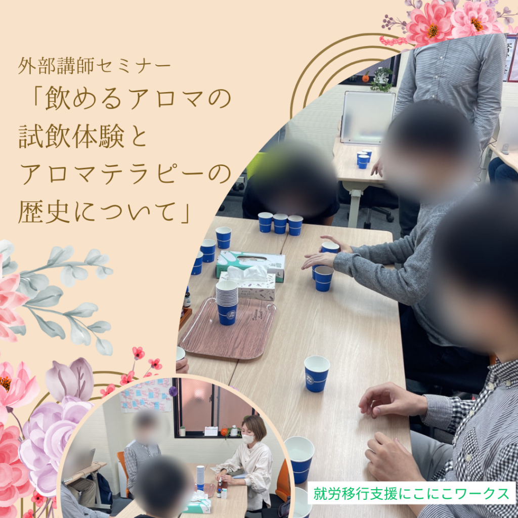 大阪市西区の就労移行支援事業所にこにこワークスで行っている精神疾患や発達障害の方へのサポート ~外部講師セミナー『飲めるアロマの試飲体験とアロマテラピーの歴史について』~