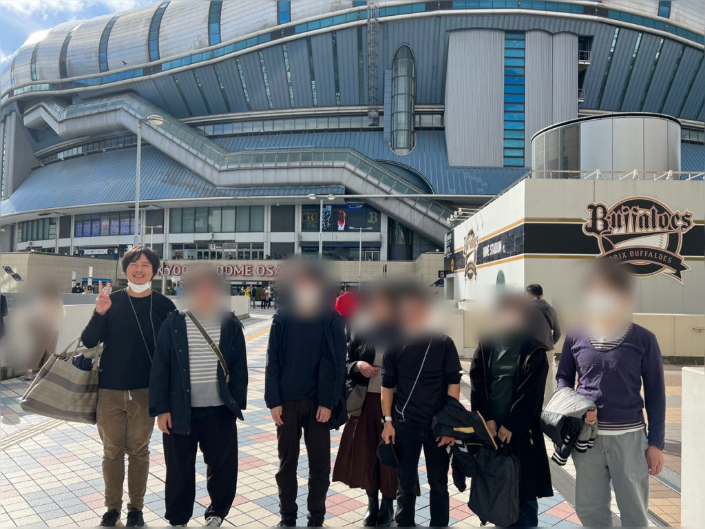 京セラドームの前でまずは集合写真。
