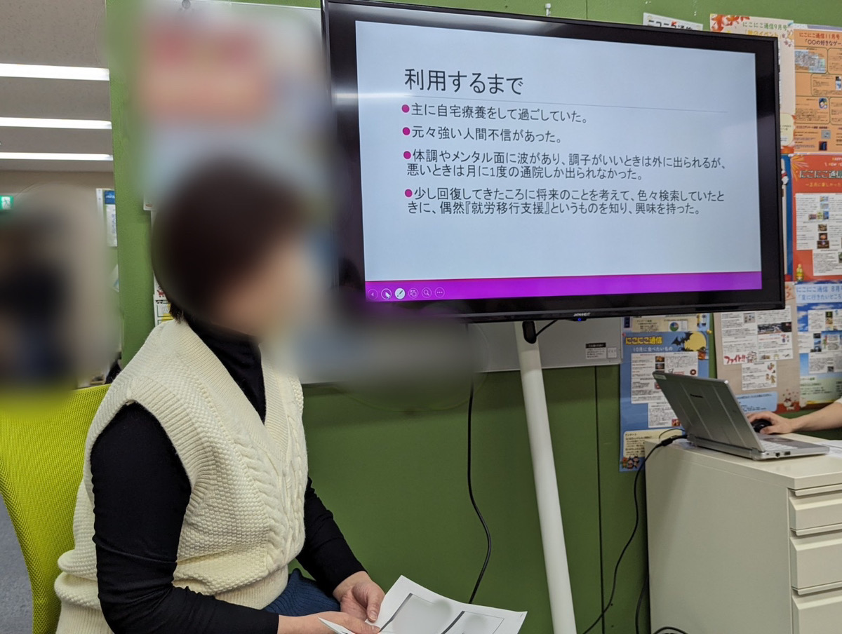・にこにこワークスに通うまでの過程 ・実際に取り組んでいた訓練の内容 ・通所してからの気持ち・行動の変化 ・就職活動の流れ ・現在のお仕事について