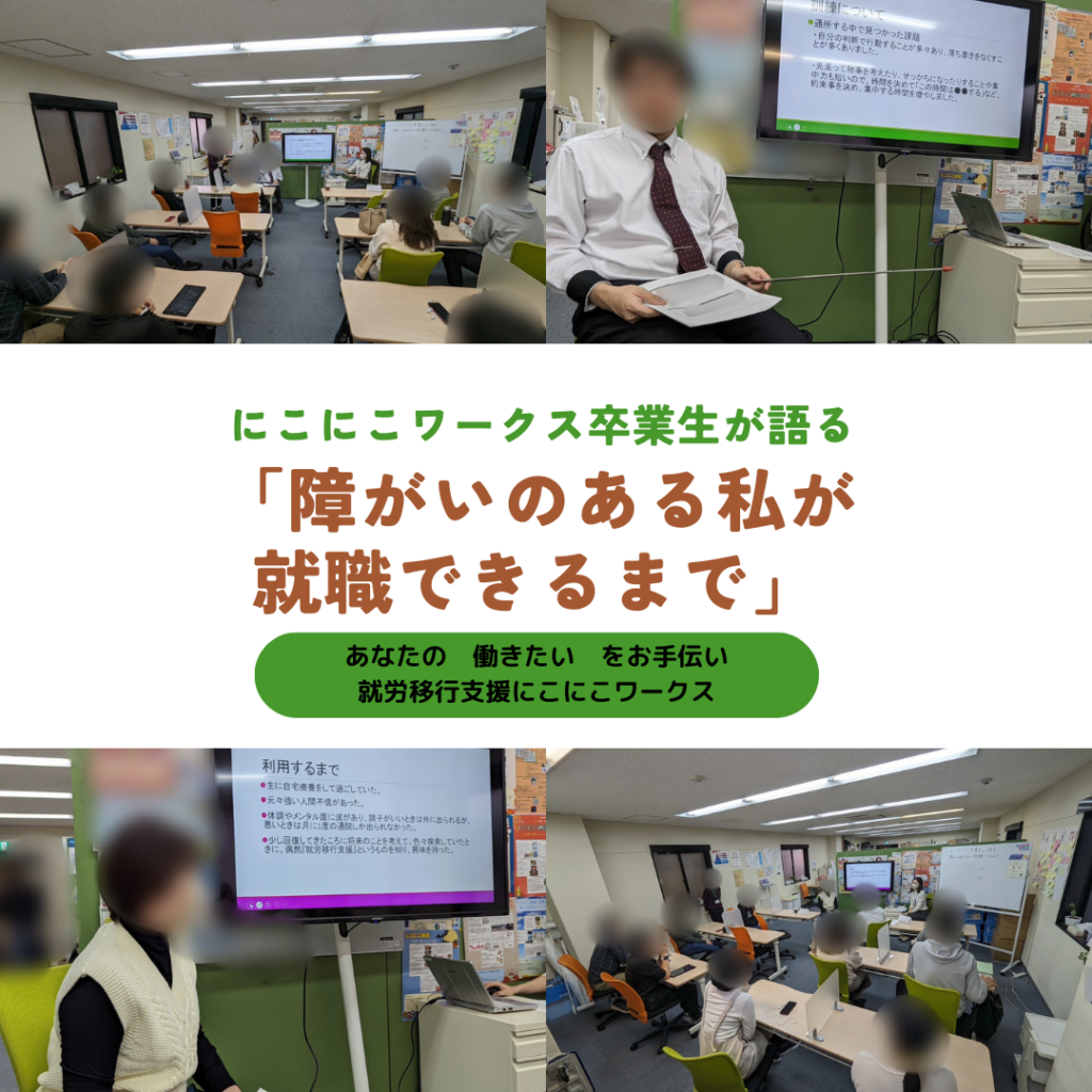 こんにちは。本日は、にこにこワークスの卒業生に 就労移行を利用するまで~働かれている現在の体験談をお話ししていただくイベント、 「にこにこワークス卒業生が語る『障がいのある私が就職できるまで』」 を開催しました!