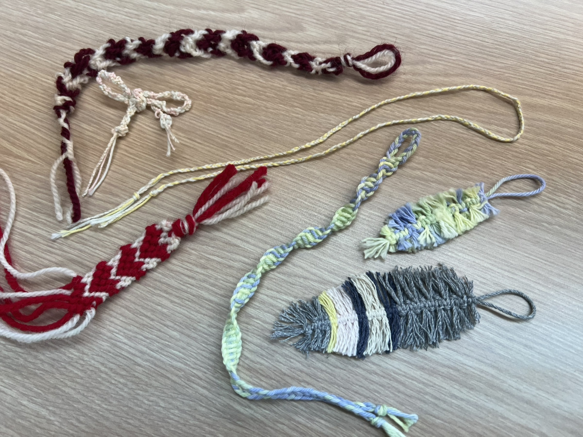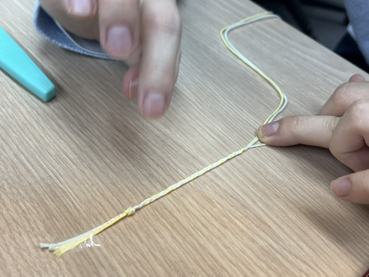 こちらは好きな色の細い毛糸を使った三つ編みのミサンガを編んでいるところです。