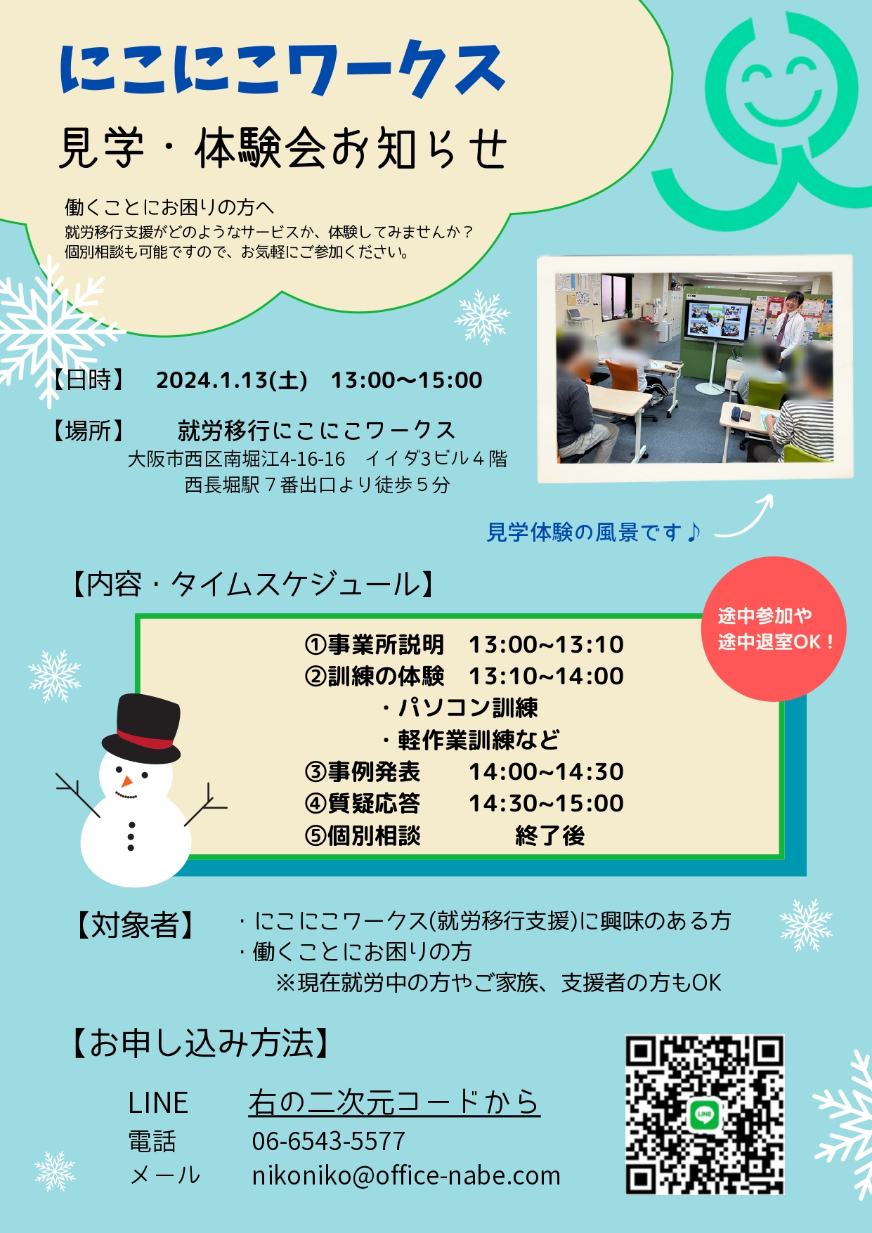 事業所名:就労移行支援事業所 にこにこワークス 所在地 :〒550-0015 大阪府大阪市西区南堀江4丁目16−16 イイダ3ビル 4F 電話番号:06-6543-5577 最寄り駅:地下鉄西長堀駅 7番出口から徒歩 2分(大阪市中央図書館付近です。) 阪神 桜川駅 2番出口から徒歩 8分(途中左手にマクドナルドが見えてきます。) ホームページ インスタグラム Facebook