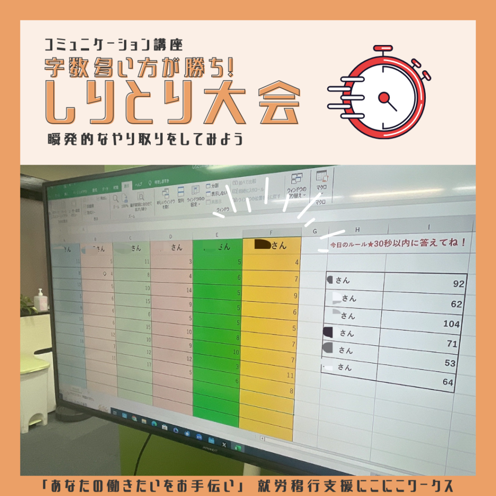 こんにちは。今日のコミュニケーション講座では、 「字数多い方が勝ち!しりとり大会」をしました!