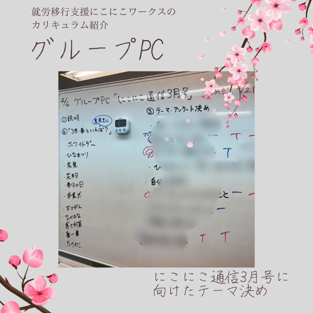 今日のグループPCでは、来月の「にこにこ通信3月号」に向けて、テーマを決めました。