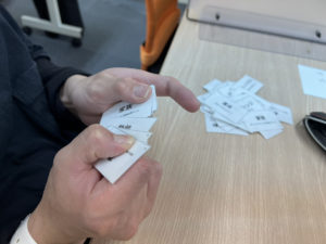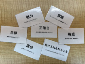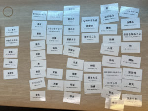 今回の講座の中では、まず85項目の「価値観カード」の中から、大切だと感じるものとそうでないものに分けていき、その中で特に大切な価値観5つを選びました。