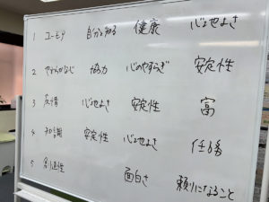 みなさん、健康や安定性など、共通しているものもあり、最低限必要と考える物を選んでいる方もいれば、「こうありたい」と理想的な自分を想像して選んでいる方もいました。