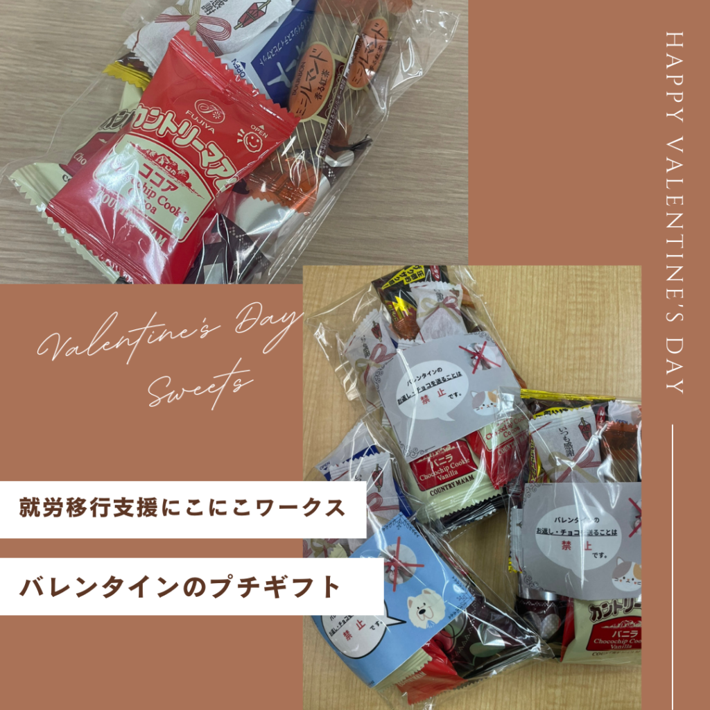 にこにこワークスでは、日々の訓練や就職活動に励まれる利用者さんたちにとって、季節を感じたり、ちょっとしたリラックスになれるような機会も作っています。 バレンタインは甘いチョコでホッと一息していただければ何よりです☺
