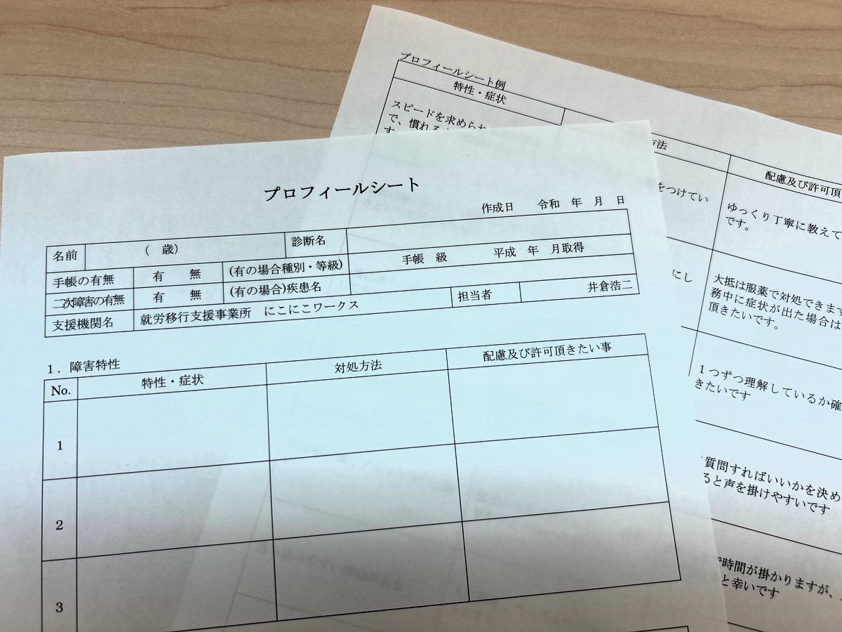 にこにこワークスでの色々な訓練を通して自分のことをたくさん知っていただき、その気づきを職員と一緒に整理しながらプロフィールシートを作成していけたらと思います。