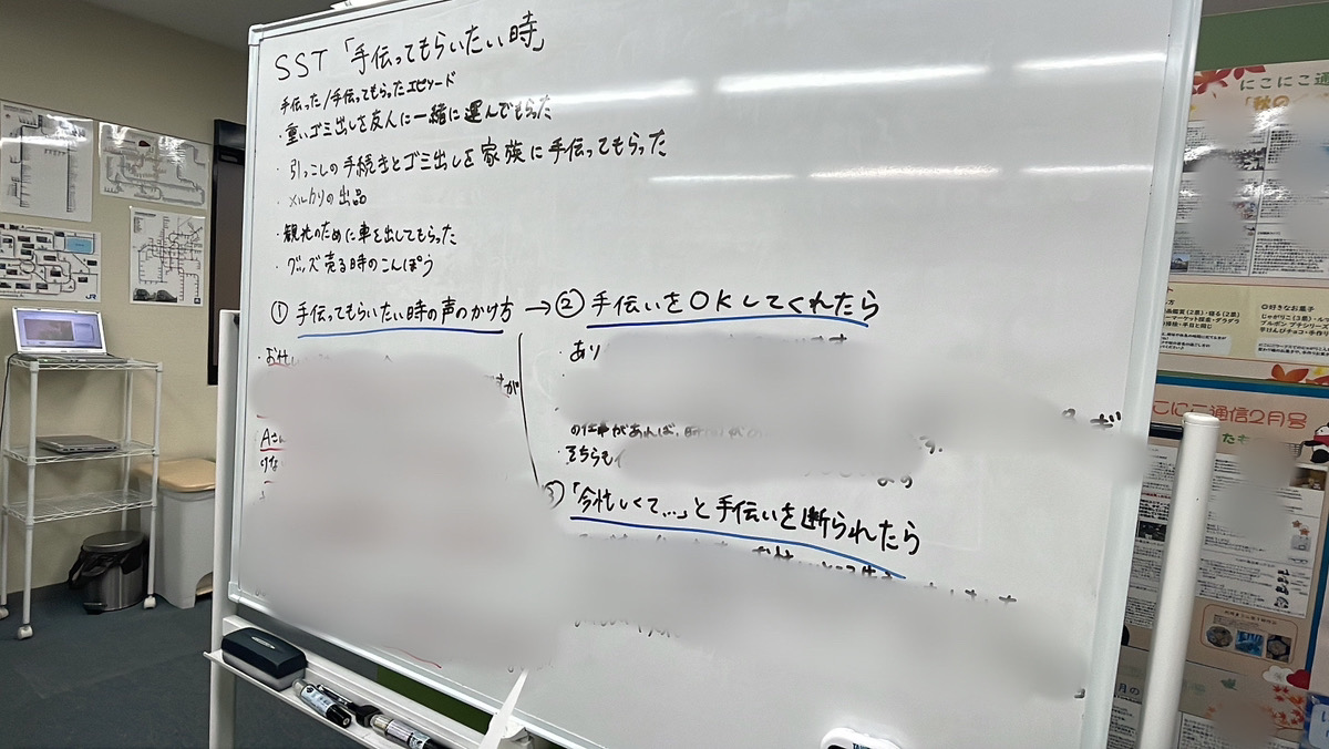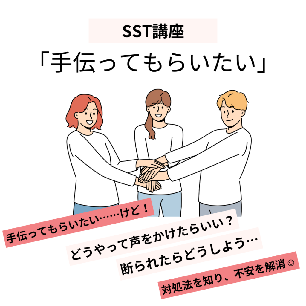 こんにちは。先日はSST講座で「手伝ってほしい時の頼み方」をテーマにしました。 みなさんは日常生活や仕事の場面で「誰かに手伝ってもらえたらなあ……」と感じたことはありますか? 利用者さんからは、引っ越しの荷物運びや、旅行の時の運転を手伝ってもらったことがあると経験談を教えていただきました。