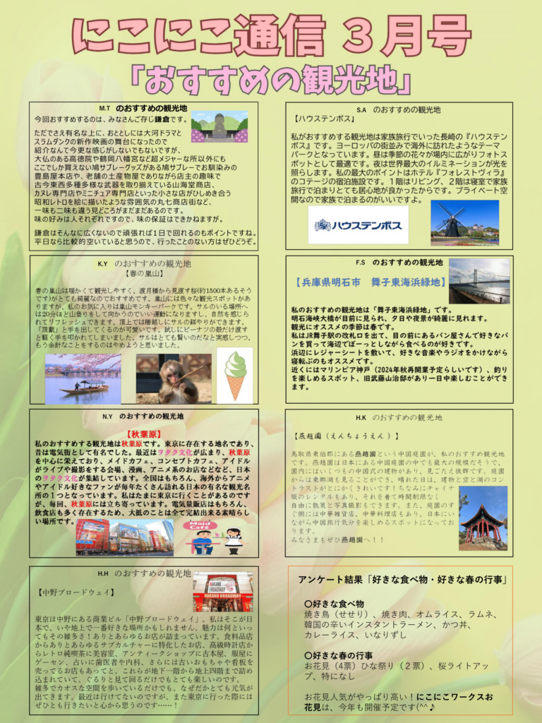 こんにちは。にこにこ通信3月号が完成しました! 今月号のテーマは「おすすめの観光地」です。