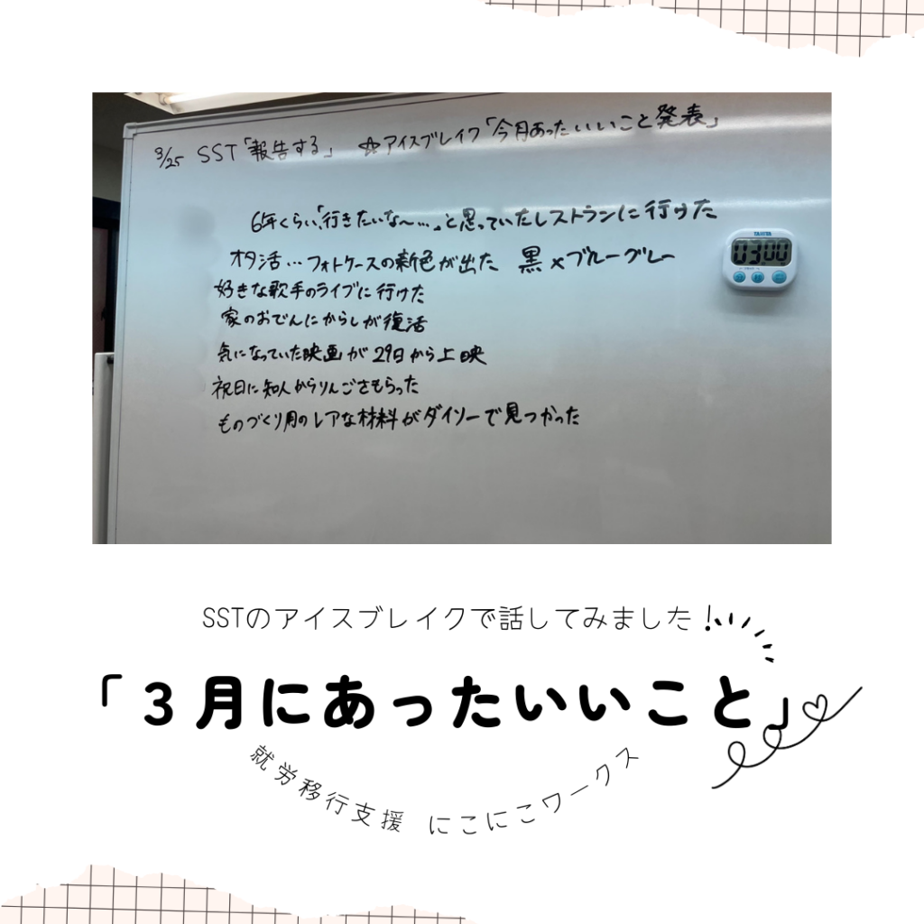 こんにちは。3月も最終週に入りましたね。 本日の講座は今月最後のSSTということもあり、アイスブレイクで「3月にあったいいこと」を発表しました。
