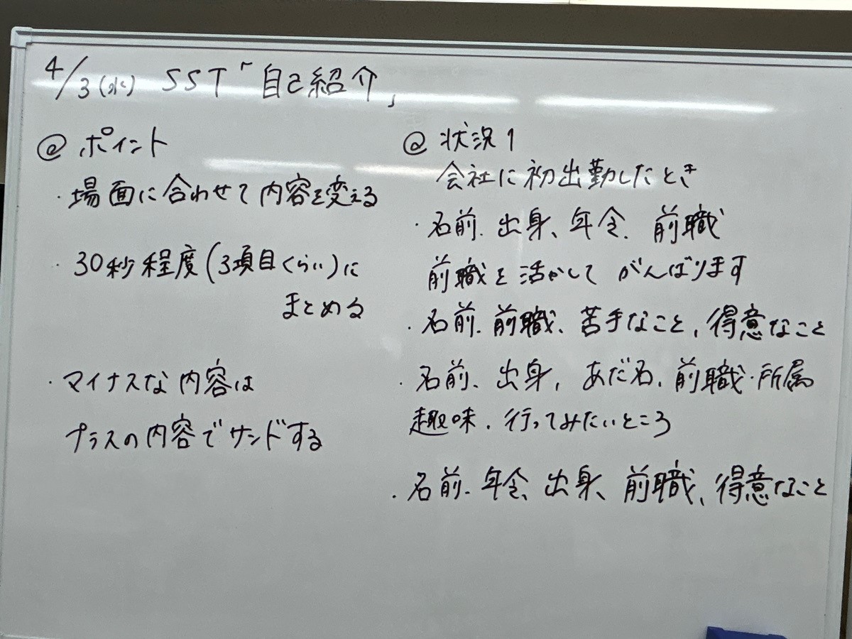 こんにちは。 昨日は、2024年度に入って初めてのSST講座でした。 今年度最初のSSTということで、自己紹介のしかたについて考えていきました。
