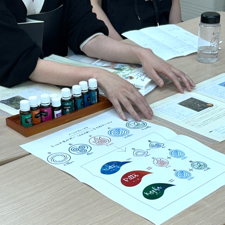 今回のテーマは「自分の体質に合わせたアロマ」。 アーユルヴェーダというインドの伝統的な医学をもとに、自分の体のバランスを整えるためのアロマの選び方を教えてくださいました。