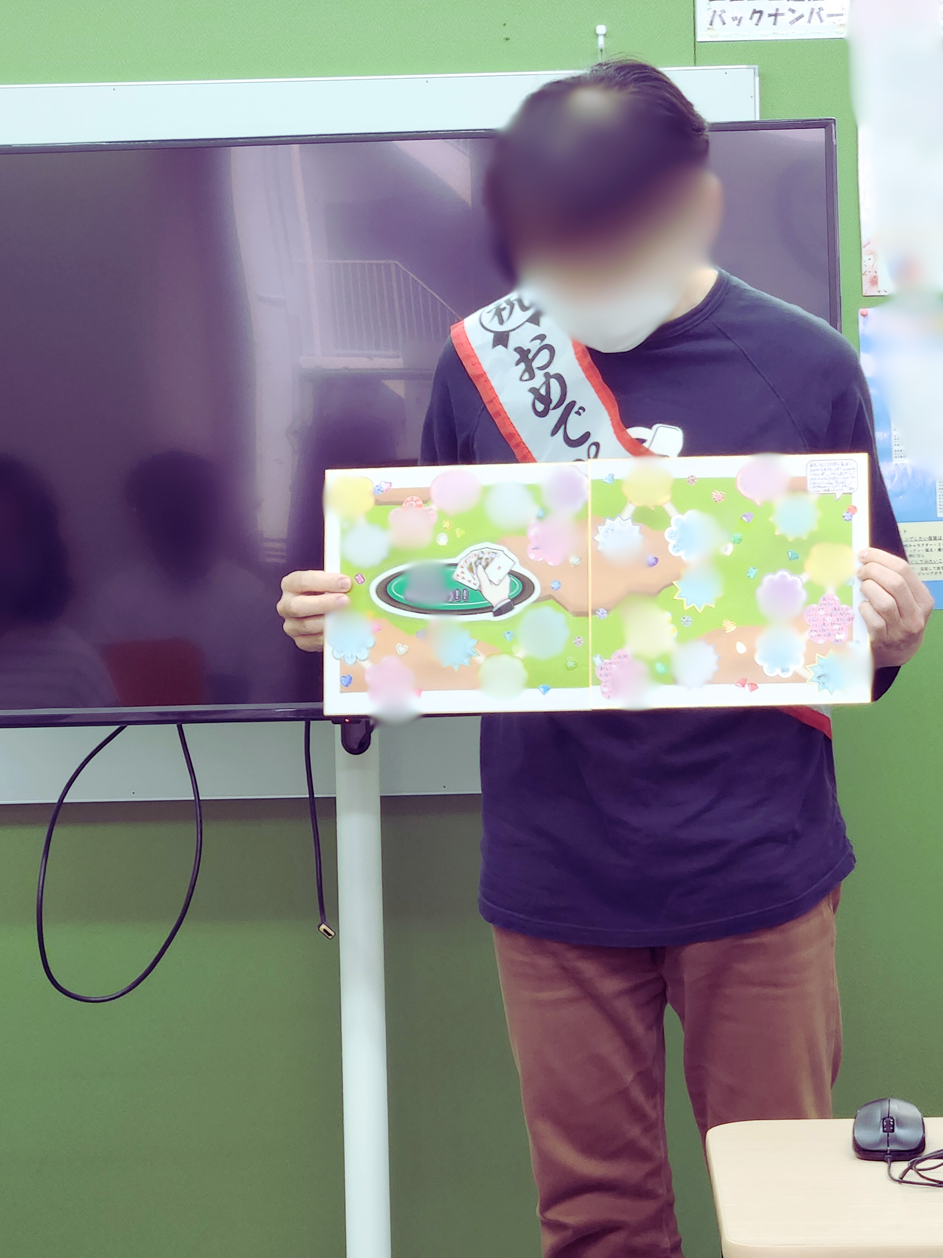 色紙は利用者さんが直々にデザインして下さったものです。?✨ Aさんが好きなボードゲームを模しており、こだわりと思いやりが感じられます。