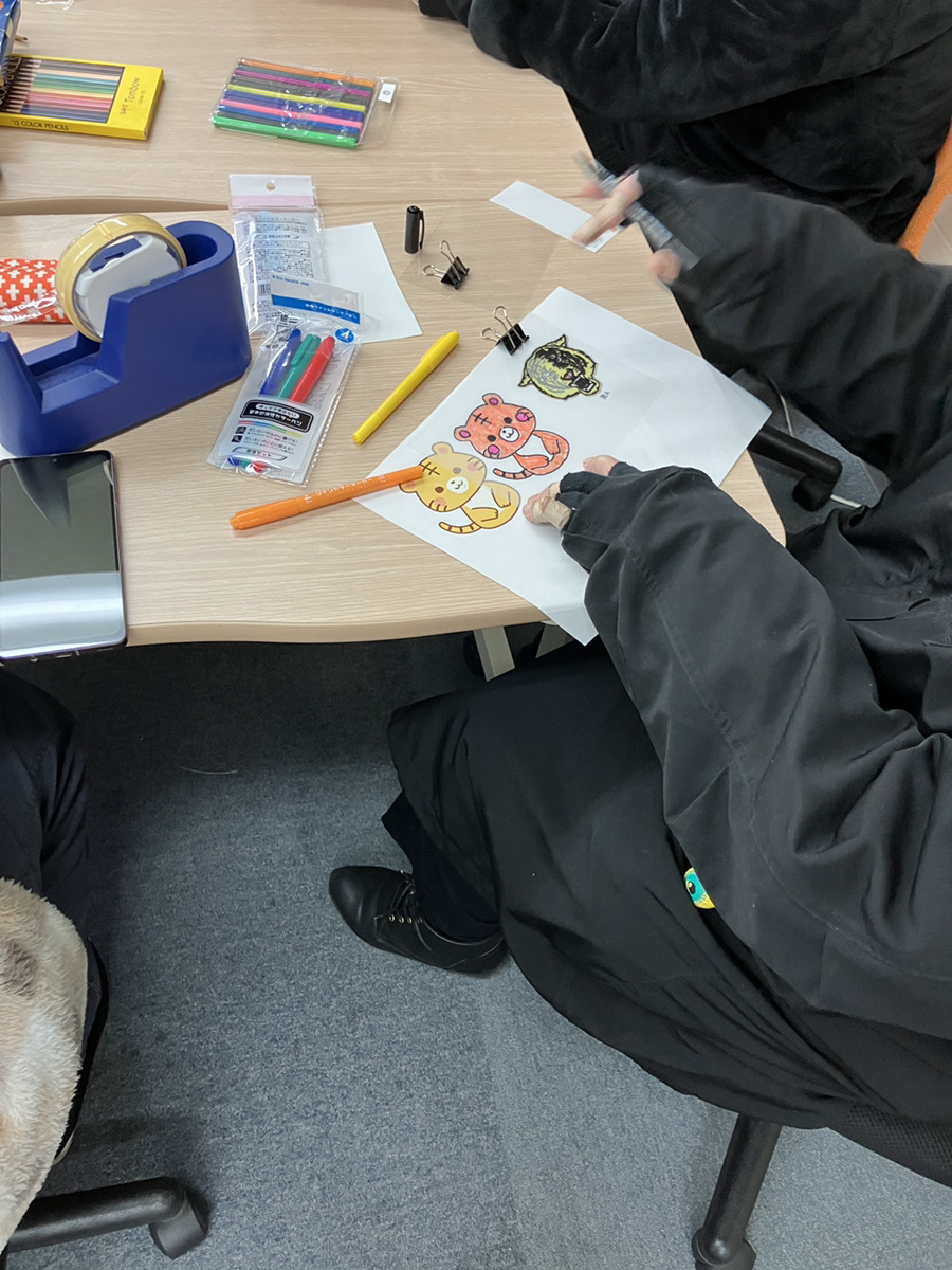 プラスチックの板に利用者に好きな絵をかいてもらい、そこから色を塗って、