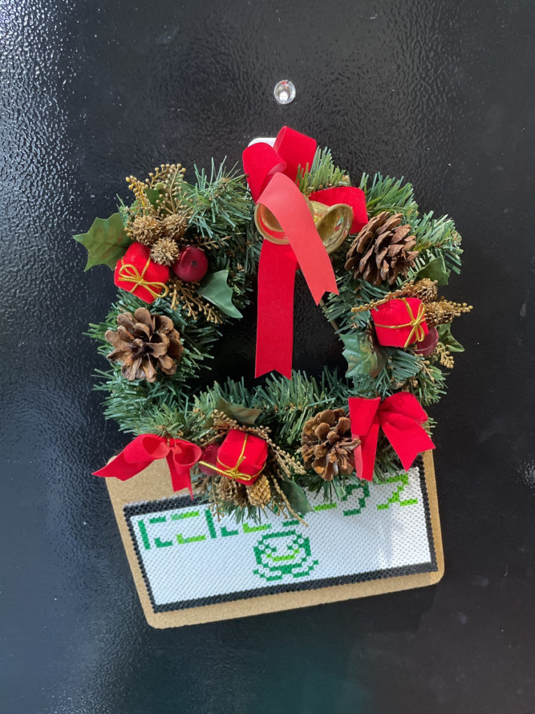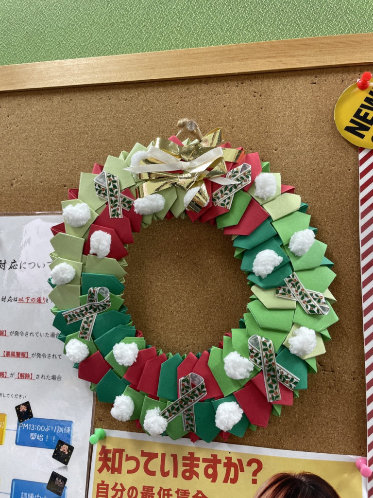 そして……入ってすぐの掲示板にも紙製のリースを飾っています。