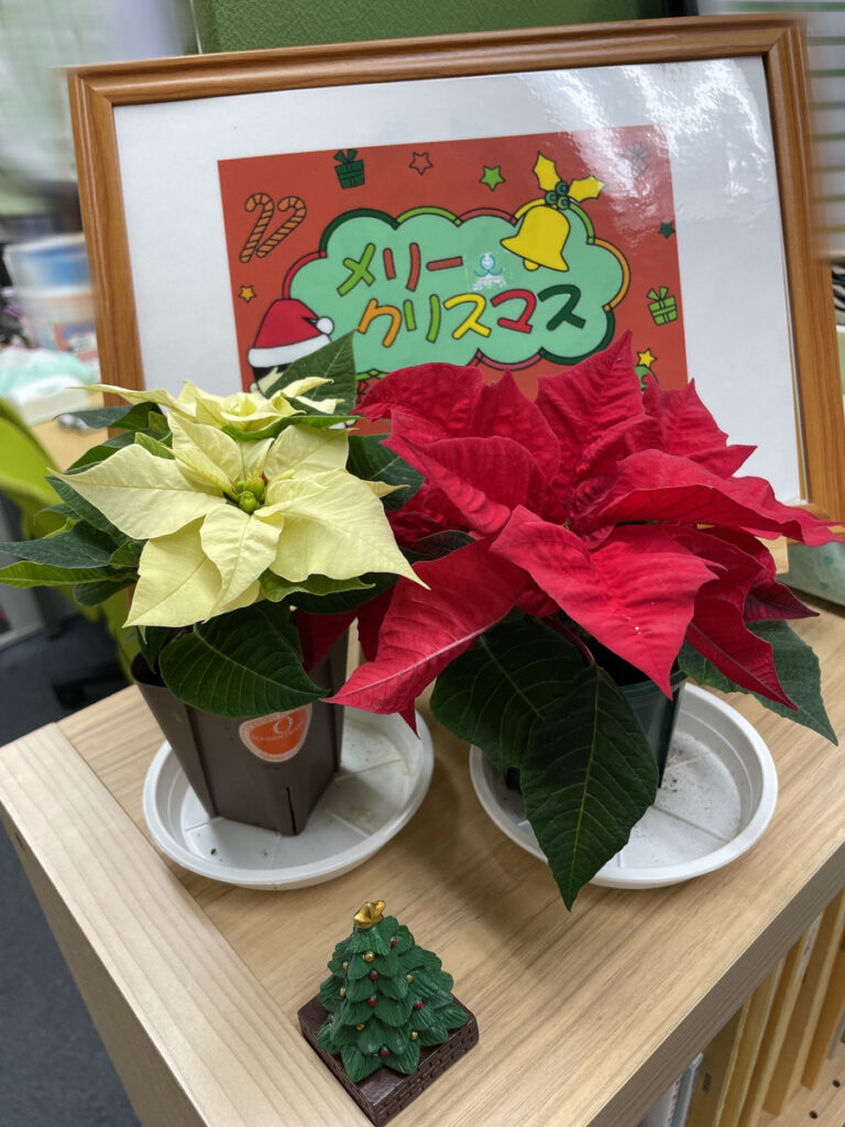訓練材料の棚の上には、利用者さんが塗ってくださったクリスマス塗り絵と、ポインセチアと、ミニツリーを飾っています。