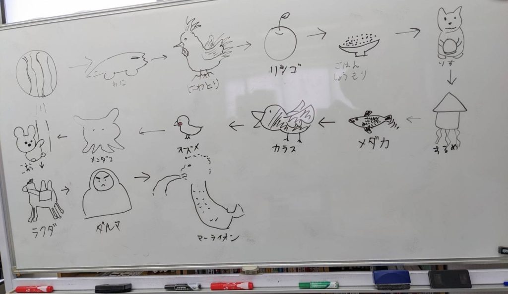 本日コミュニケーションでの一コマです。 話すことだけがコミュニケーションではありません。 とのことで、皆様に絵しりとりをしていただきました。 盛り上がるので一年に何回かさせていただきますが、 今回も笑わせていただきました。