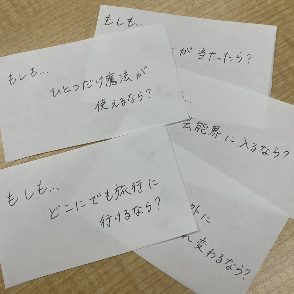 質問には、「もしも、どこにでも旅行に行けるとしたらどこに行きたい?」「もしも、なにかひとつ魔法を使えるとしたら何にする?」「もしも芸能界に入るなら何をしたい?」といったものがあります。
