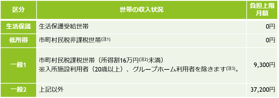 注3:入所施設利用者(20歳以上)、グループホーム利用者は市町村民税課税世帯の場合「一般2」となります。
