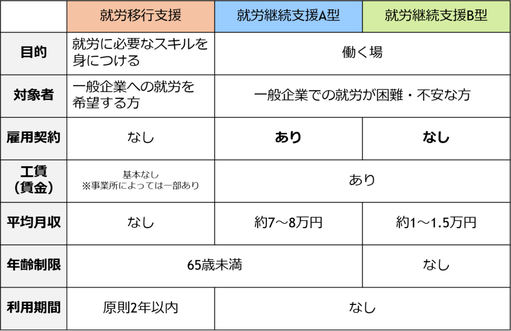 今回は、就労移行支援・就労継続支援A型・就労継続支援B型のお話をさせていただきましたが、どこが良いといった優劣はありません。