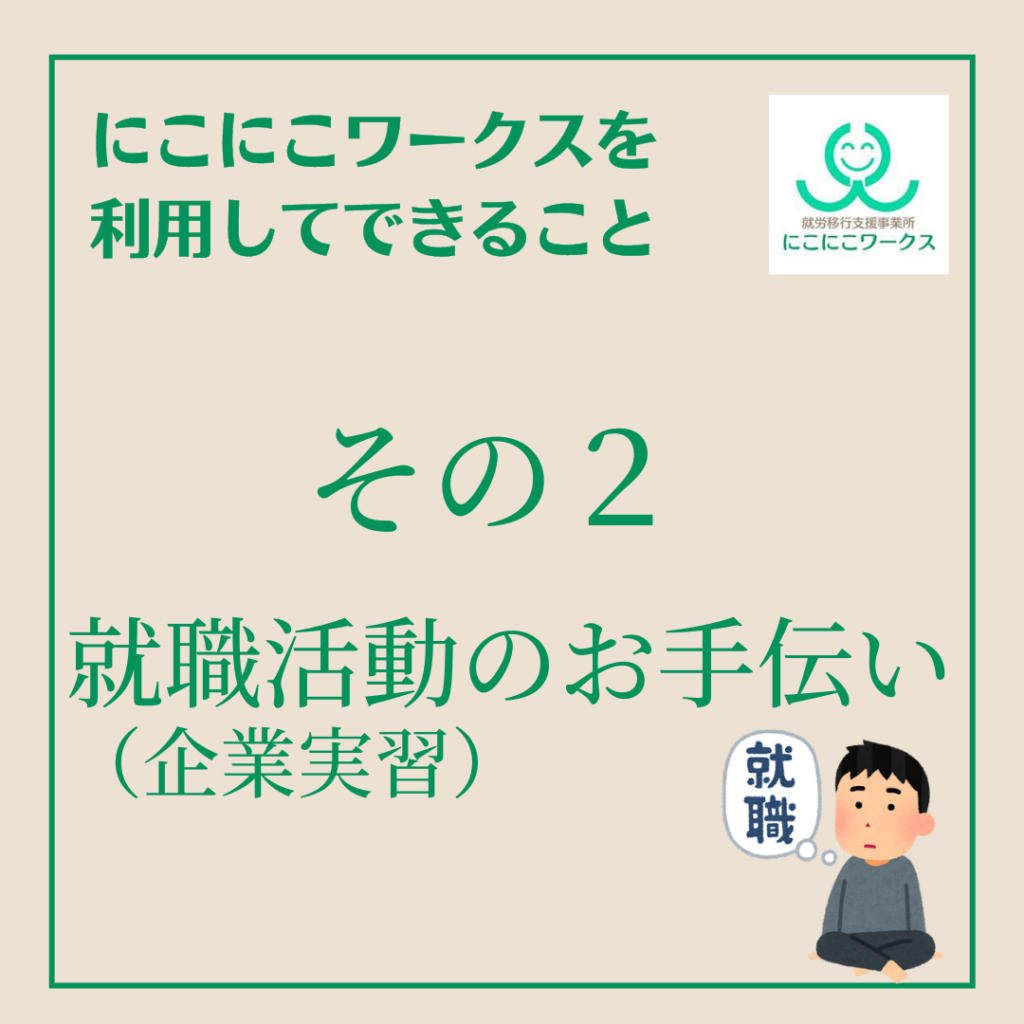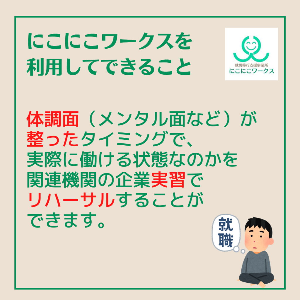 にこにこワークスを利用してできること 体調面(メンタル面など)整ったタイミングで、実際に働ける状態なのかを関連機関の企業実習でリハーサルすることができます。