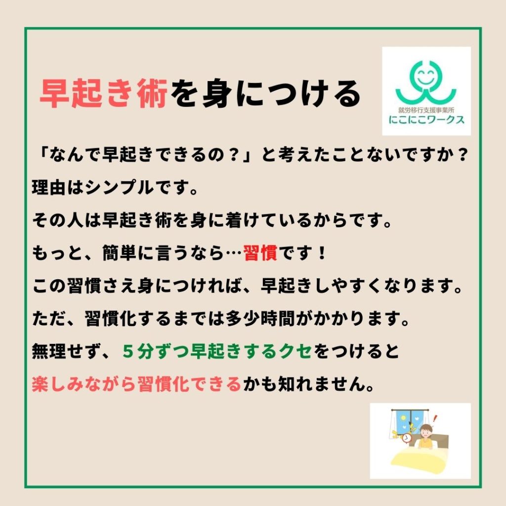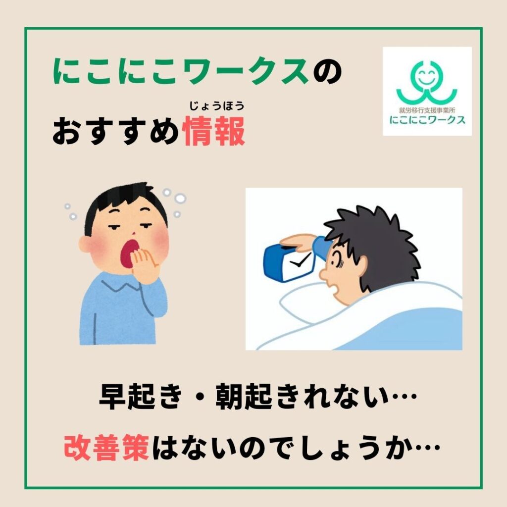 大阪市西区の就労移行支援事業所 にこにこワークスでは、発達障害や精神疾患で悩む方々のお手伝いを行っています。(おすすめ情報 生活習慣 早起き 編)
