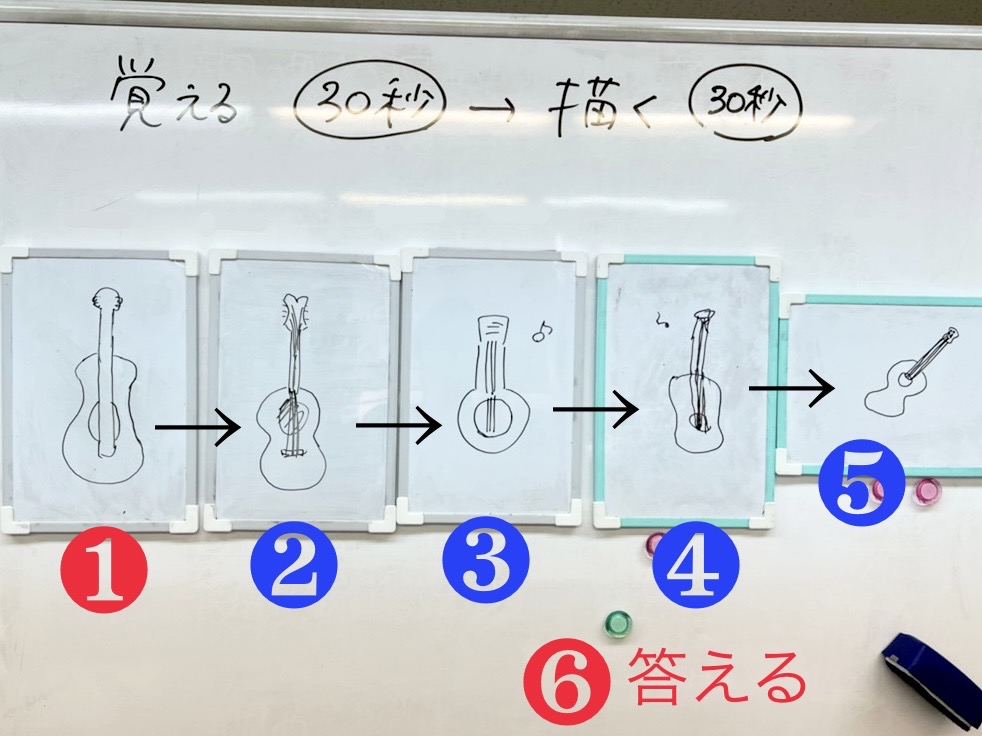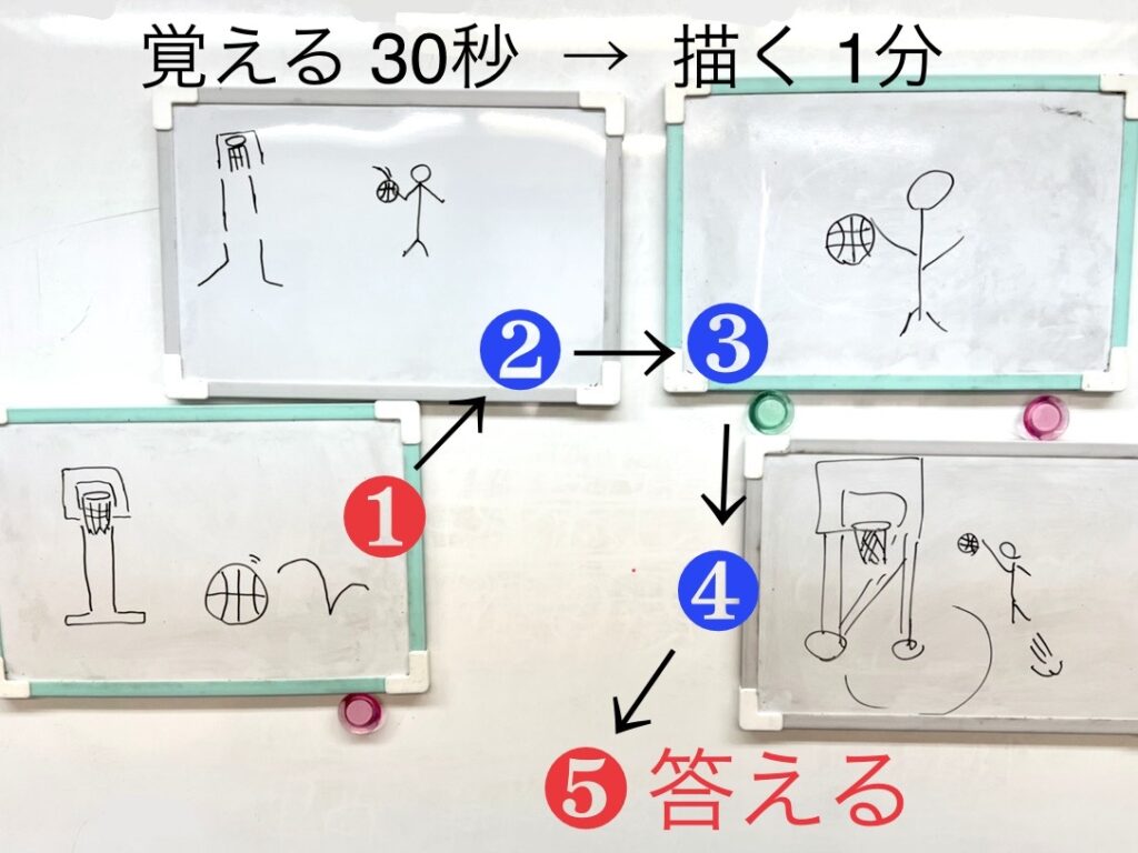 ①番目の人だけがお題を見て覚え、イラストを描きます。 ↓ ②番目の人からは前の方が描いたイラストを覚えて描いて次の方に伝えていき、最後の方がお題が何かを答える!…という流れです。