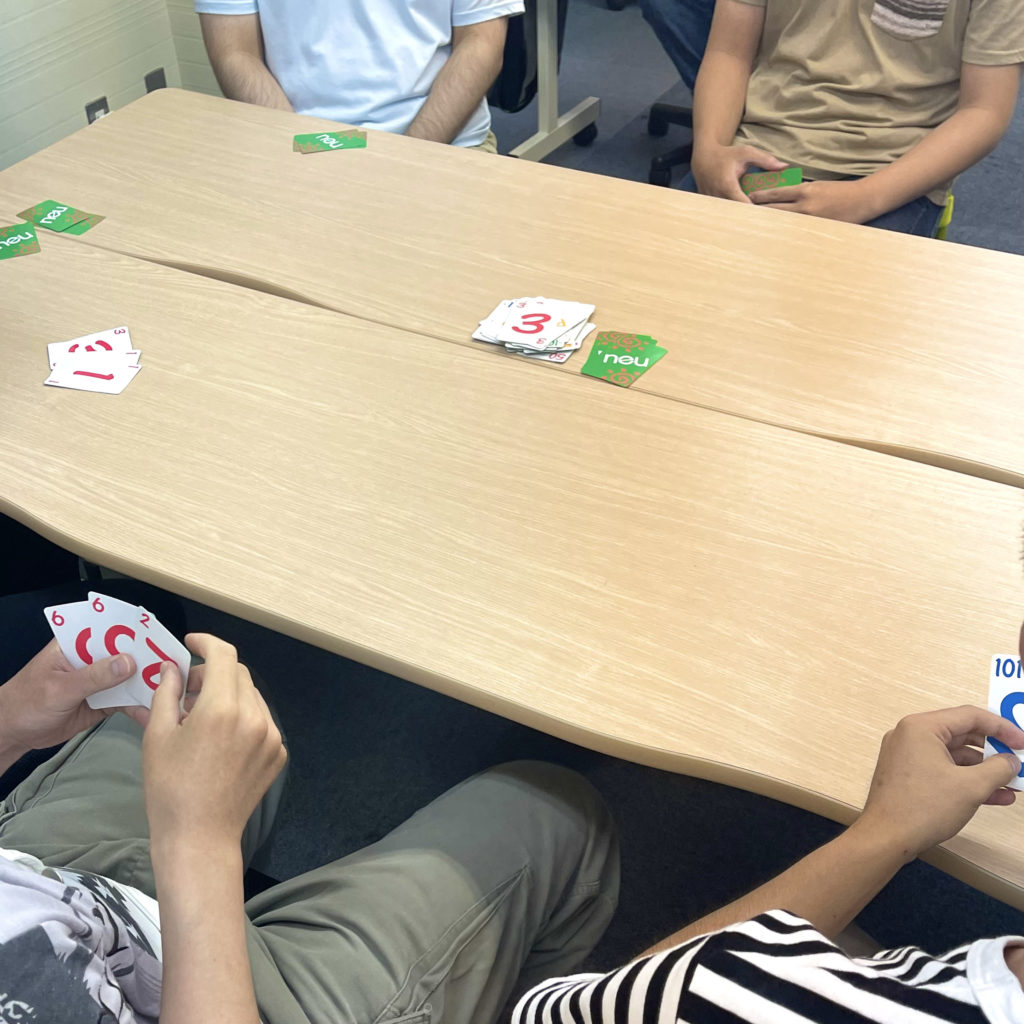 ドイツのカードゲーム「6 Nimmt!」(ニムト)と「Neu」(ノイ)を皆でやりました。 にこにこワークスのベテランスタッフがどこから仕入れてきたのか、どちらも馴染みあるルールながらも戦略性が問われる、何時間でも遊びたいカードゲームとなっております。 (講座の時間は1時間だけですが… (*´з`) ニムトは七並べを発展させたようなゲームで、手札から順に出していきカードがなくなれば勝ち。 でも出せる手札がなかったり、6枚目に出すのが自分になったら場のカードを取らされ、カードに描かれた牛の数だけマイナスポイントとなります。
