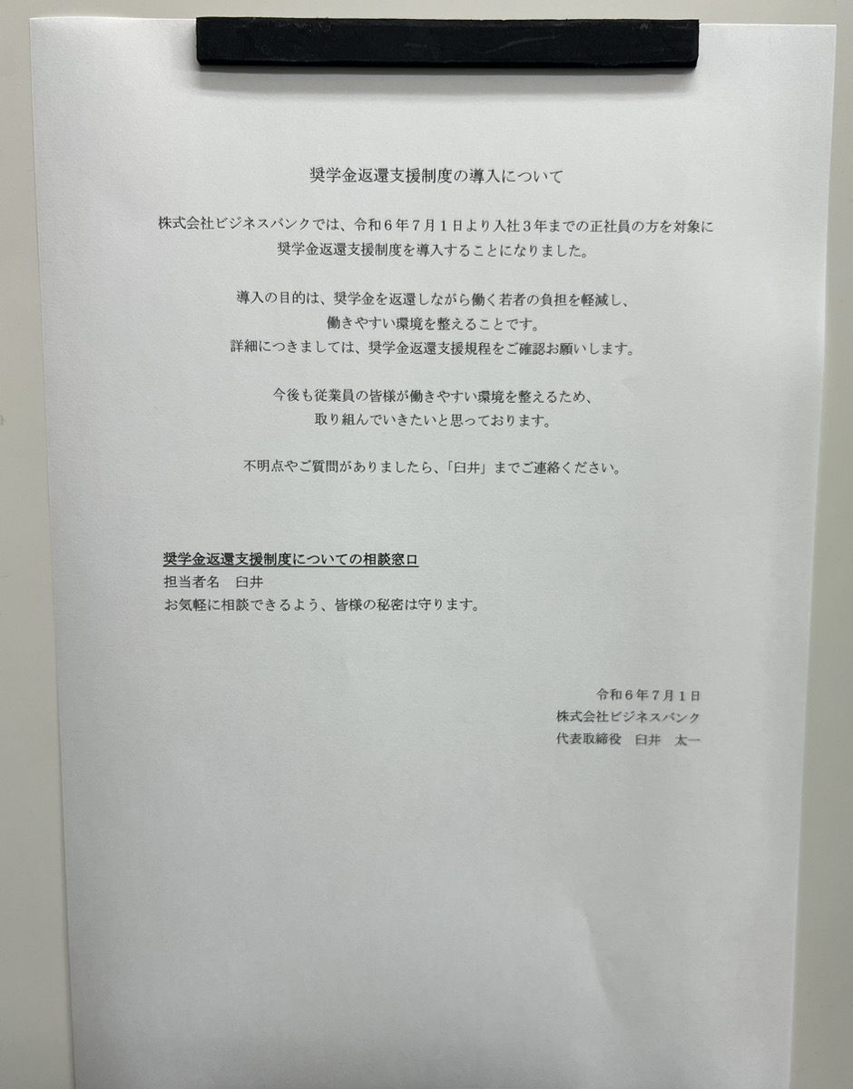 株式会社ビジネスバンクでは、令和6年7月1日より入社3年までの正社員の方を対象に奨学金返還支援制度を導入することになりました。